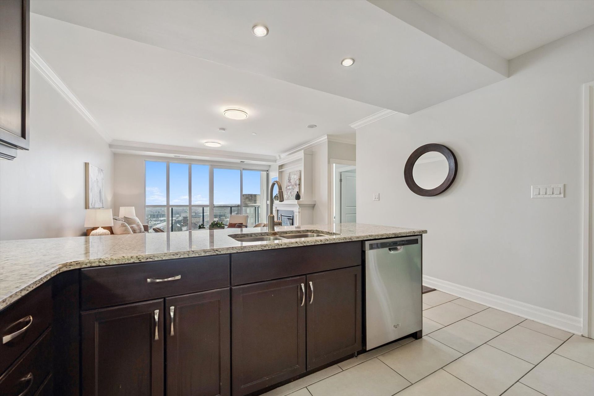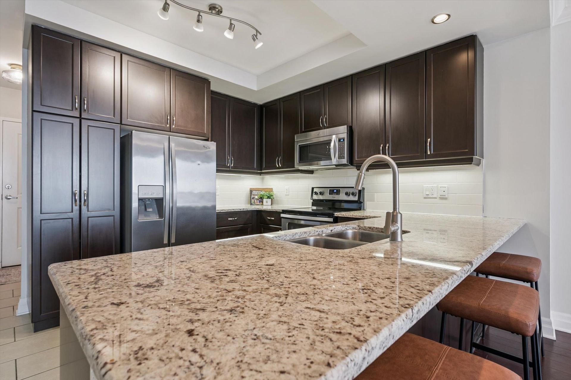 Welcome to Suite 1108 at The Riverhouse, one of Guelph's most sought-after condominium residences known for its quiet atmosphere, upscale feel, and exceptional management. Perfectly positioned in the heart of downtown, you're just steps from the GO Station, Sleeman Centre, River Run Centre, scenic walking trails, and Guelph's best restaurants, cafés, and shops - offering a truly walkable lifestyle. This spacious 1 bedroom plus den suite offers a highly functional and versatile layout. The large den with French doors is ideal as a second bedroom or work-from-home office. Rich hardwood flooring, granite countertops, modern lighting, and a cozy fireplace create a sophisticated living environment. The open-concept kitchen is designed for everyday living and entertaining, featuring full-size stainless steel appliances, ample cabinetry, and a peninsula with bar seating that flows into the generous living and dining area. Sliding doors lead to an oversized private balcony-perfect for enjoying sunset views over downtown. The bright primary bedroom boasts an oversized walk-in closet, with a spacious 4-piece bathroom offering abundant counter space (or easily convert to a dual vanity!). A welcoming foyer with double coat closet and a dedicated laundry/storage room with added cabinetry enhances everyday functionality. Residents enjoy exceptional amenities, including an incredible rooftop terrace with BBQs, elegant party room and lounge with kitchen, media room, library, fitness centre, and well-appointed guest suite. Recent updates include fresh paint, new bedroom carpeting, added laundry room cabinetry, modern lighting, new kitchen faucet, and new toilet. This unit also includes a well-located, owned parking space! Ideally suited for commuting professionals, modern couples, or downsizers seeking refined, low-maintenance living in an unbeatable location. *Most utilities are conveniently covered in the condo fees, and storage lockers are available to rent for $35 per month.