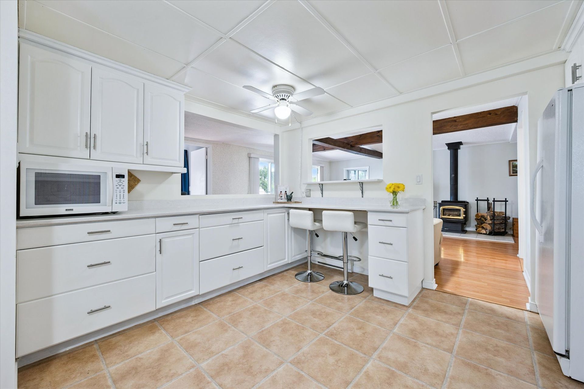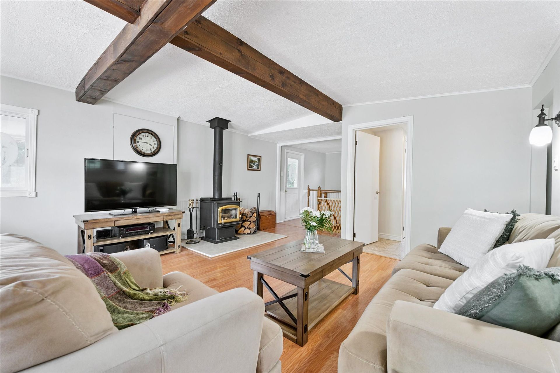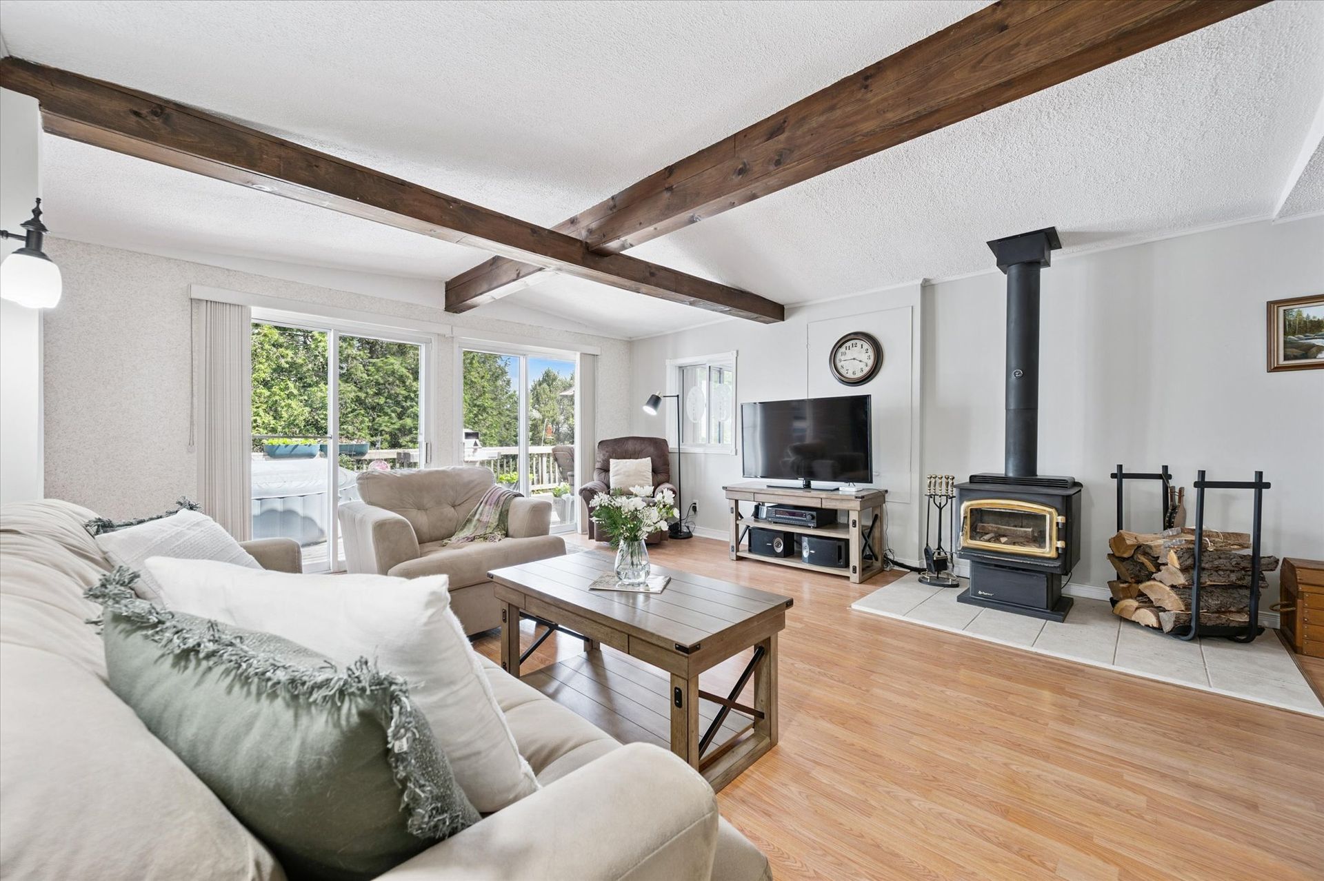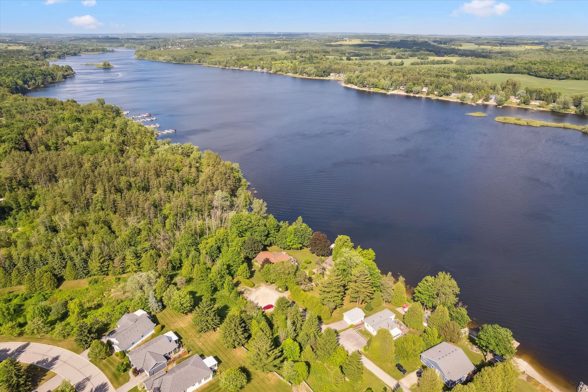 The one you've been waiting for! Located on one of Lake Belwood's most sought-after roads with prime lake access, this four-season residence is a private paradise - just minutes from Fergus and only 1.5 hours from downtown Toronto. Impeccably maintained and tastefully updated over the years, this turnkey property is ready for you to move in and start making memories with 100 feet of stunning lake frontage. Spanning over 2,200 square feet of finished living space, the home features 2+2 bedrooms and 2 full bathrooms, including a walk-out lower level built on a newer foundation. The detached 1.5-car garage provides ample storage, while the rare boathouse - complete with 190 feet of launching rails - makes boating effortless. Inside, the open-concept kitchen with quartz countertops flows into a cozy living room with a charming wood-burning stove. Dine in the spacious sunroom or step out to the raised deck to enjoy panoramic views and cool lake breezes. The primary bedroom offers breathtaking lake views and direct deck access - perfect for quiet mornings with a coffee in hand. A second main-floor bedroom is tucked away for added privacy, while the updated 3-piece bathroom features heated floors and a conveniently located laundry area. The lower level includes a generous rec/flex room, two additional bedrooms (one with a double French door walkout), and a second full bathroom. Work from home? Enjoy Cogeco high-speed Fiber internet. Outside, professional hardscaping, including retaining walls, complements the gently sloping lawn that leads to a large stone patio and sandy shoreline - ideal for kids, grandkids, and pets to play! Water is supplied by Pine Meadows 300 deep well, tested daily for quality. This home is being sold fully furnished and includes lawn equipment, a floating dock, BBQ, and hot tub - everything you need for a seamless transition to lake life. Don't miss this rare opportunity to own a slice of paradise on Lake Belwood!